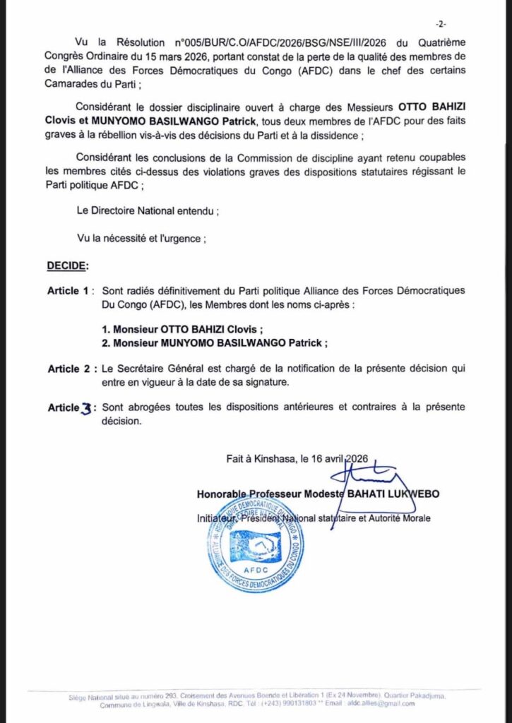 L’Alliance des Forces Démocratiques du Congo (AFDC) a pris une décision forte et sans équivoque. Réuni en session, le Directoire national du parti a acté, à l’unanimité, la radiation d’Otto Bahizi et de Patrick Munyomo de ses rangs.