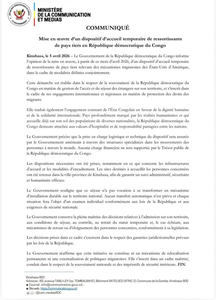 Il va sans dire que la République Démocratique du Congo, terres d’hospitalité, tient toutefois aux résolutions levées sur sa politique migratoire et sur les conditions de séjour des étrangers, précise Patrick Muyaya dans un communiqué daté du 5 Avril 2026.